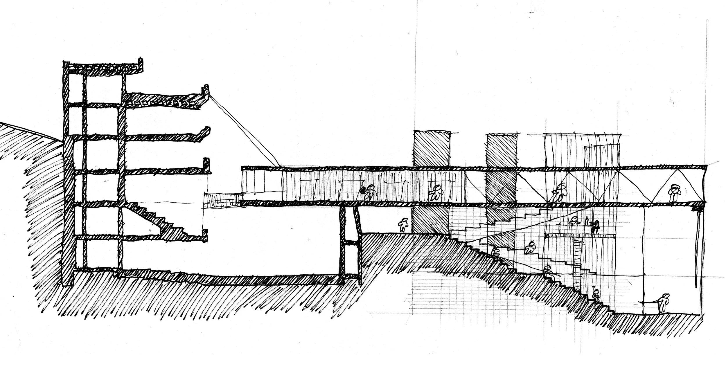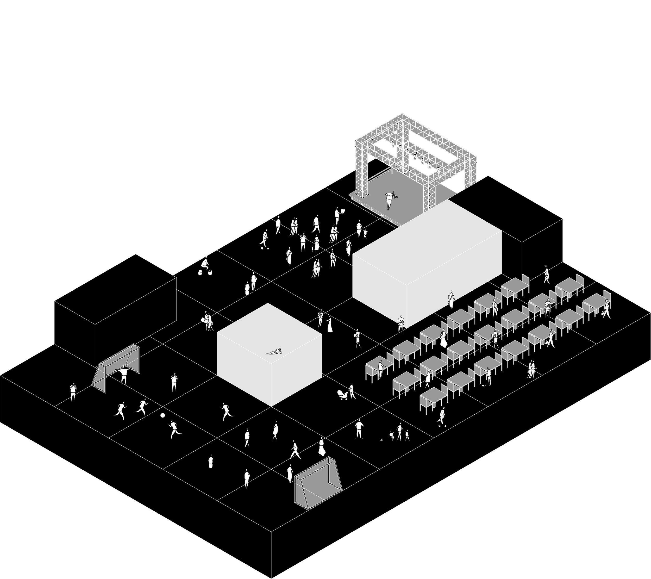 The cafe shaft is a vertically mobile room that travels between the production level, the educational level, and the piazza. Its movement is scheduled according to daily patterns of use, allowing it to serve a lecture hall, library, and the public square at different times of day. When at the piazza, it activates the space through food, seating, and informal gathering; when below, it supports academic and support spaces. The cafe becomes both a social catalyst and a service core, linking public life to the interior program through motion.